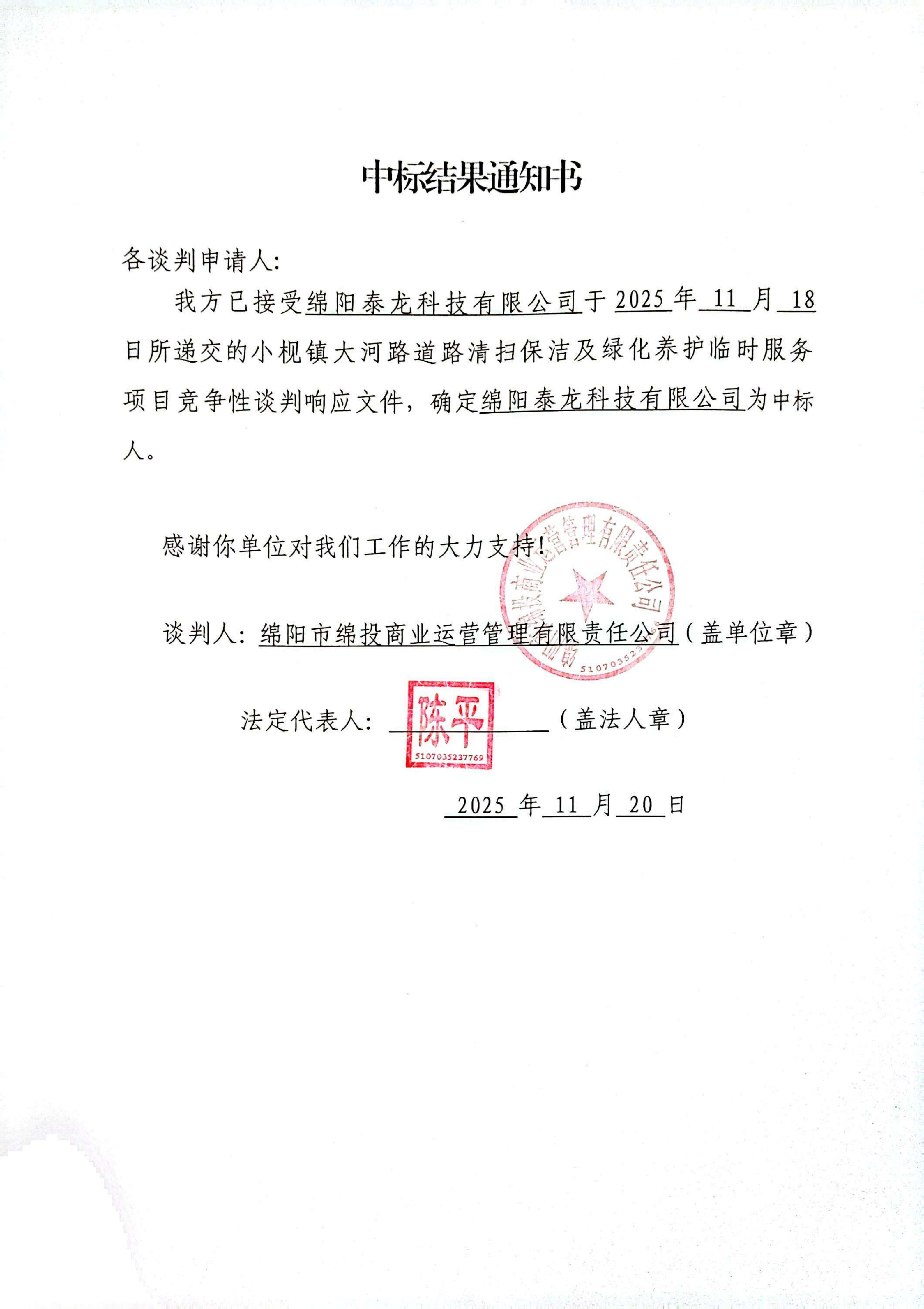 我方已接受綿陽泰龍科技有限公司于2025年 11 月 18 日所遞交的小枧鎮(zhèn)大河路道路清掃保潔及綠化養(yǎng)護(hù)臨時服務(wù)項(xiàng)目競爭性談判響應(yīng)文件,確定綿陽泰龍科技有限公司為中標(biāo)人。