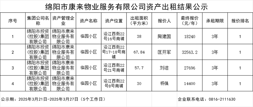 綿陽市康來物業(yè)服務有限公司資產(chǎn)出租結(jié)果公示