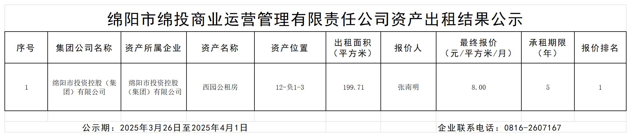 綿陽市綿投商業(yè)運營管理有限責任公司資產(chǎn)出租結(jié)果的公示