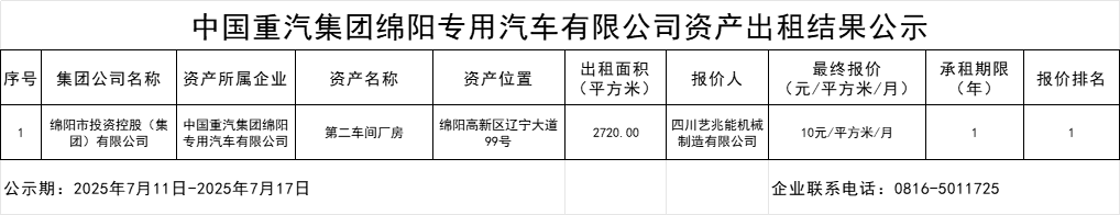中國重汽集團(tuán)綿陽專用汽車有限公司資產(chǎn)出租結(jié)果公示
