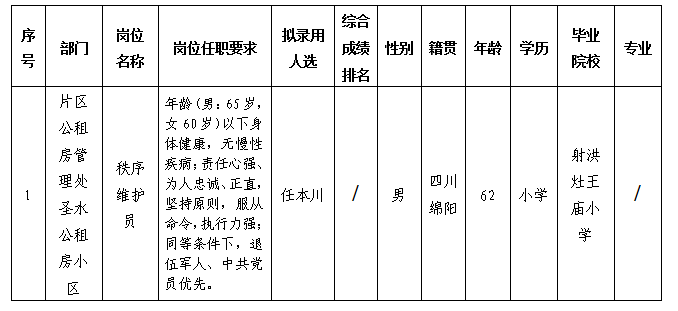 根據(jù)康居公司發(fā)布的長期招聘一線勤雜人員的招聘公告相關規(guī)定,經面試、體檢等程序,擬錄用任本川同志到綿陽市康居房產經營管理有限公司片區(qū)公租房管理處圣水公租房小區(qū)工作,現(xiàn)予以公示,具體情況如下: