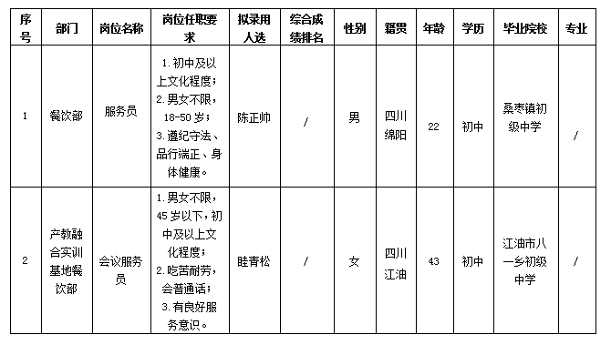 根據(jù)綿陽市綿州嘉來會務服務有限公司發(fā)布的招聘公告及招聘相關規(guī)定,經(jīng)面試、體檢等程序,擬錄用陳正帥、眭青松同志到餐飲部、產(chǎn)教融合實訓基地餐飲部工作,現(xiàn)予以公示,具體情況如下: