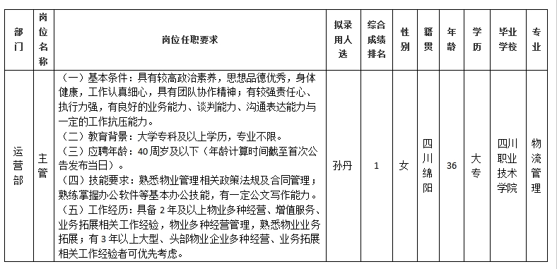 根據綿陽市康來物業(yè)服務有限公司發(fā)布的招聘公告及招聘相關規(guī)定,經筆試、面試、背景調查等程序,擬錄用孫丹同志到綿陽市康來物業(yè)服務有限公司運營部工作,現予以公示,具體情況如下: