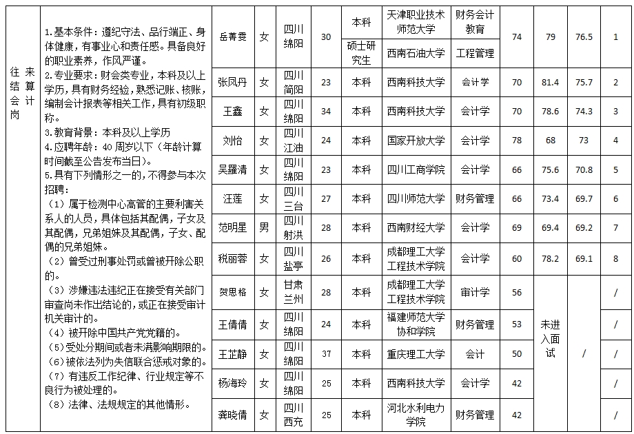 根據(jù)綿陽(yáng)市建設(shè)工程質(zhì)量檢測(cè)中心有限責(zé)任公司發(fā)布的招聘公告及招聘相關(guān)規(guī)定,現(xiàn)將筆試、面試成績(jī)予以公示。