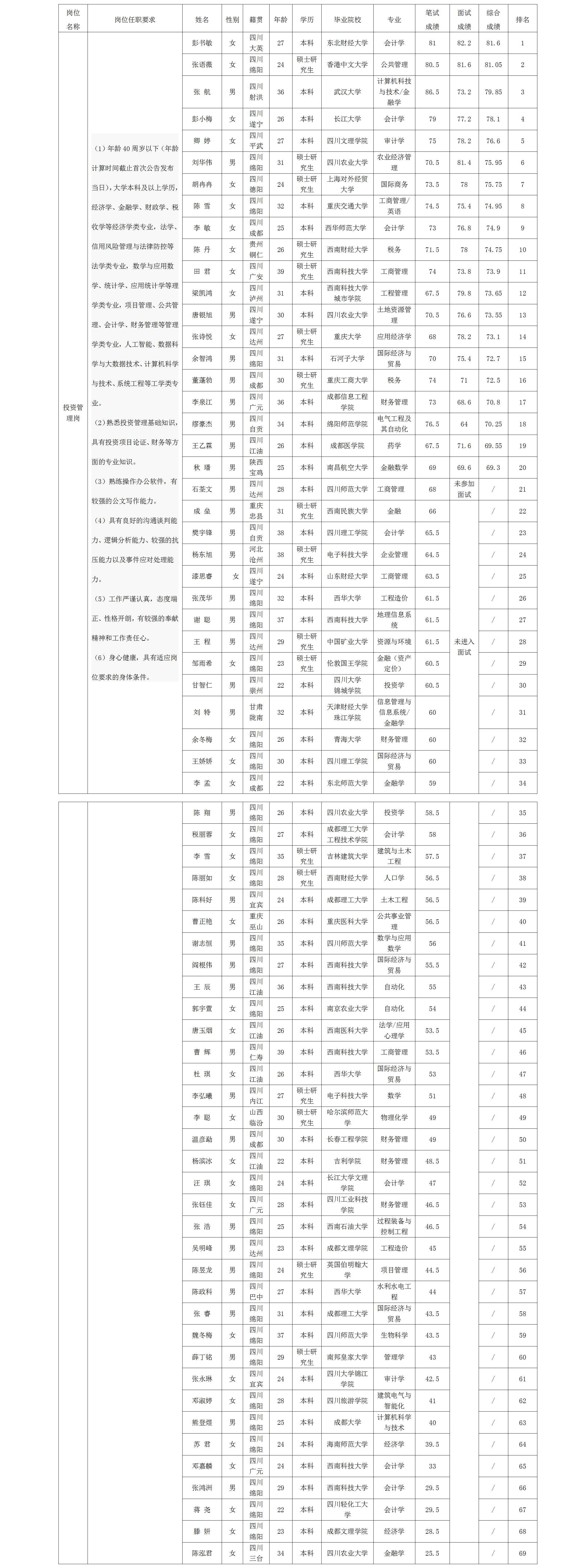 根據(jù)綿陽(yáng)市投資控股(集團(tuán))有限公司發(fā)布的招聘公告及招聘相關(guān)規(guī)定,經(jīng)筆試、面試等程序,現(xiàn)將筆試(面試)成績(jī)予以公示。