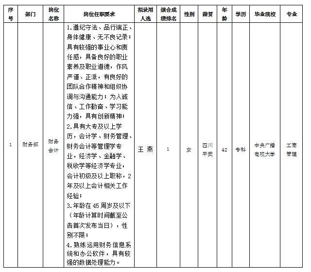 根據(jù)綿陽市綿州嘉來會務服務有限公司發(fā)布的招聘公告及招聘相關規(guī)定,經(jīng)筆試、面試、考察、體檢等程序,擬錄用王燕同志到財務部工作,現(xiàn)予以公示,具體情況如下: