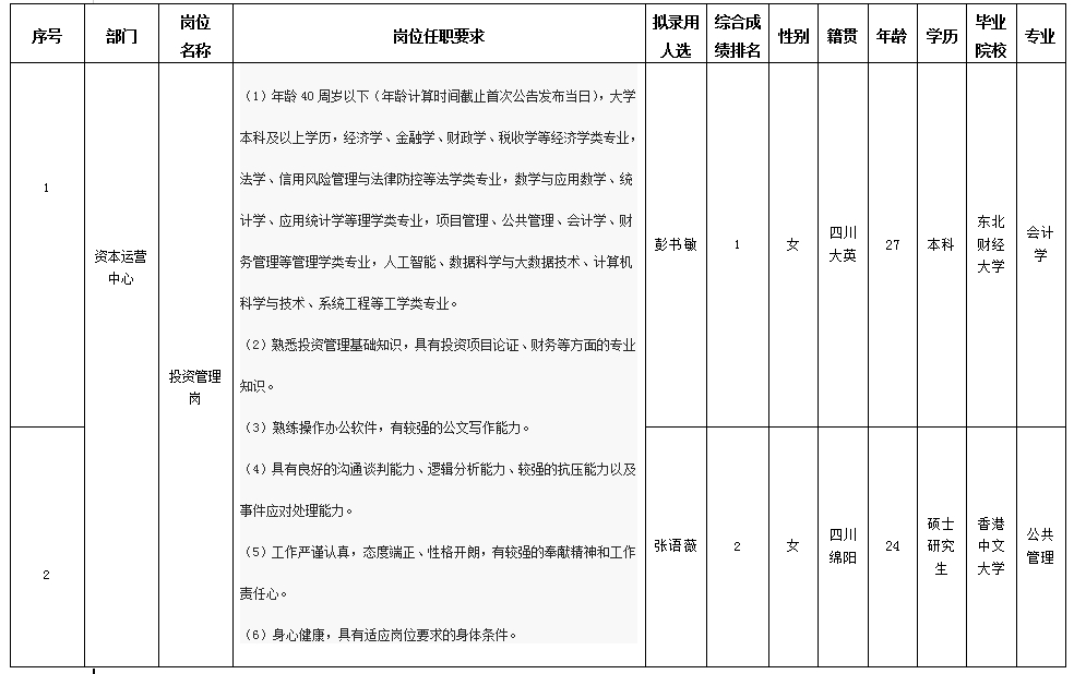 根據綿陽市投資控股(集團)有限公司發(fā)布的招聘公告及招聘相關規(guī)定,經筆試、面試、考察、體檢等程序,擬錄用彭書敏等同志到綿陽市投資控股(集團)有限公司工作,現予以公示,具體情況如下: