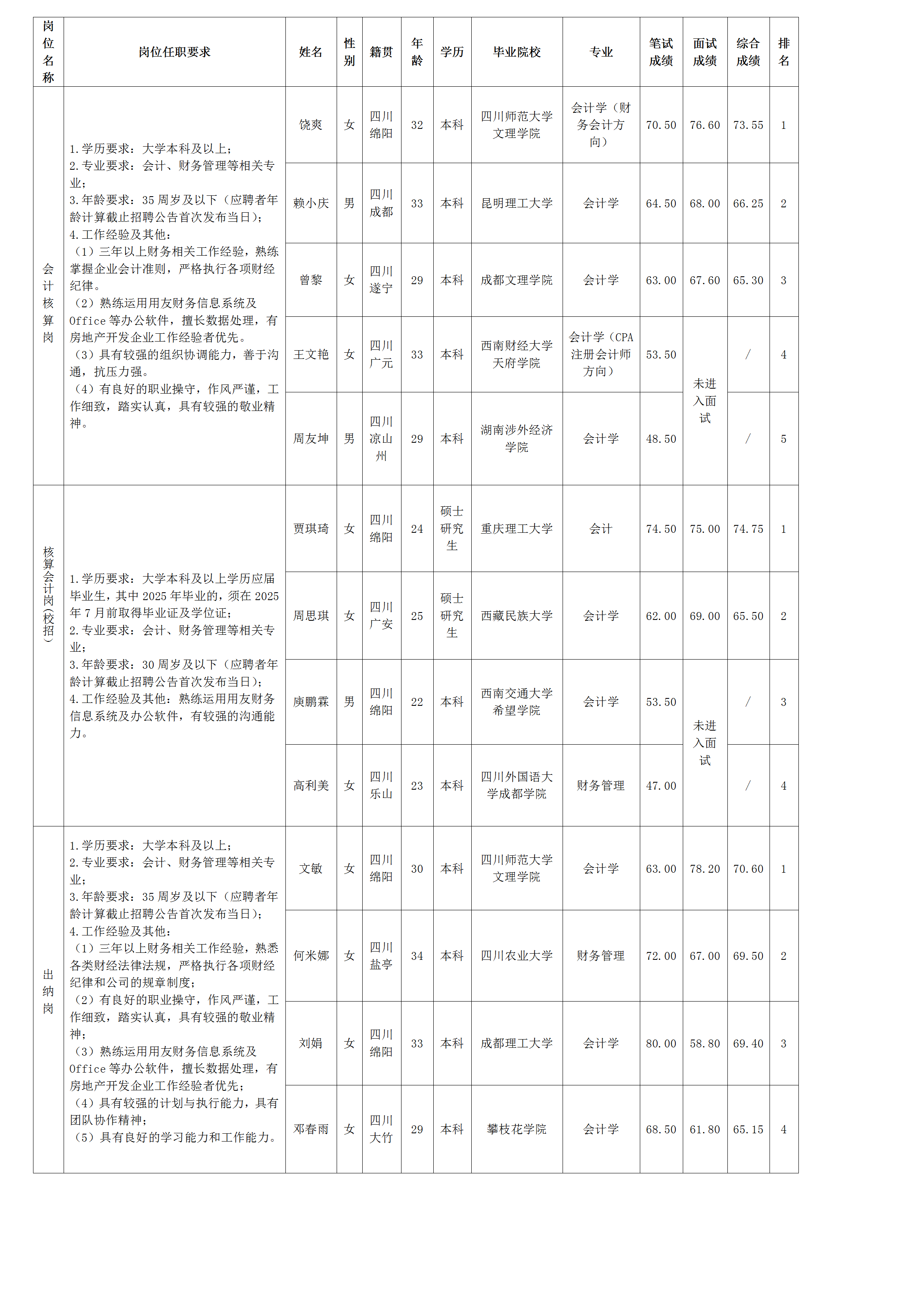 根據綿陽市綿投置地有限公司發(fā)布的招聘公告及招聘相關規(guī)定,經筆試、面試等程序,現(xiàn)將筆試、面試成績予以公示。