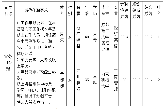 根據(jù)綿陽富樂山九洲國際酒店有限公司關(guān)于客務(wù)部經(jīng)理內(nèi)部競聘公告及招聘相關(guān)規(guī)定,經(jīng)競聘演講、現(xiàn)場答辯等程序,現(xiàn)將競聘成績予以公示。