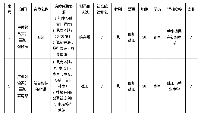 根據(jù)綿陽市綿州嘉來會(huì)務(wù)服務(wù)有限公司發(fā)布的招聘公告及招聘相關(guān)規(guī)定,經(jīng)面試、體檢等程序,擬錄用陳興熠、張陽同志到產(chǎn)教融合實(shí)訓(xùn)基地餐飲部、客房部工作,現(xiàn)予以公示,具體情況如下: