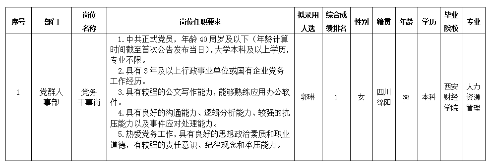 根據(jù)綿陽(yáng)市投資控股(集團(tuán))有限公司發(fā)布的招聘公告及招聘相關(guān)規(guī)定,經(jīng)筆試、面試、考察、體檢等程序,擬錄用郭琳同志到綿陽(yáng)市投資控股(集團(tuán))有限公司工作,現(xiàn)予以公示,具體情況如下: