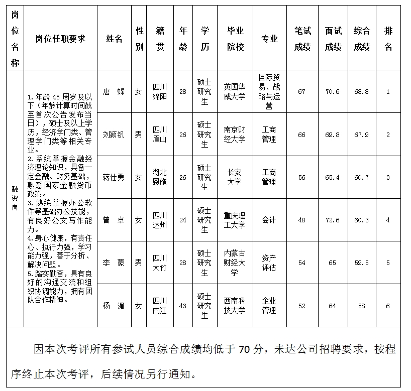 根據綿陽金控投資管理有限責任公司發(fā)布的招聘公告及招聘相關規(guī)定,經筆試、面試等程序,現(xiàn)將筆試(面試)成績予以公示。