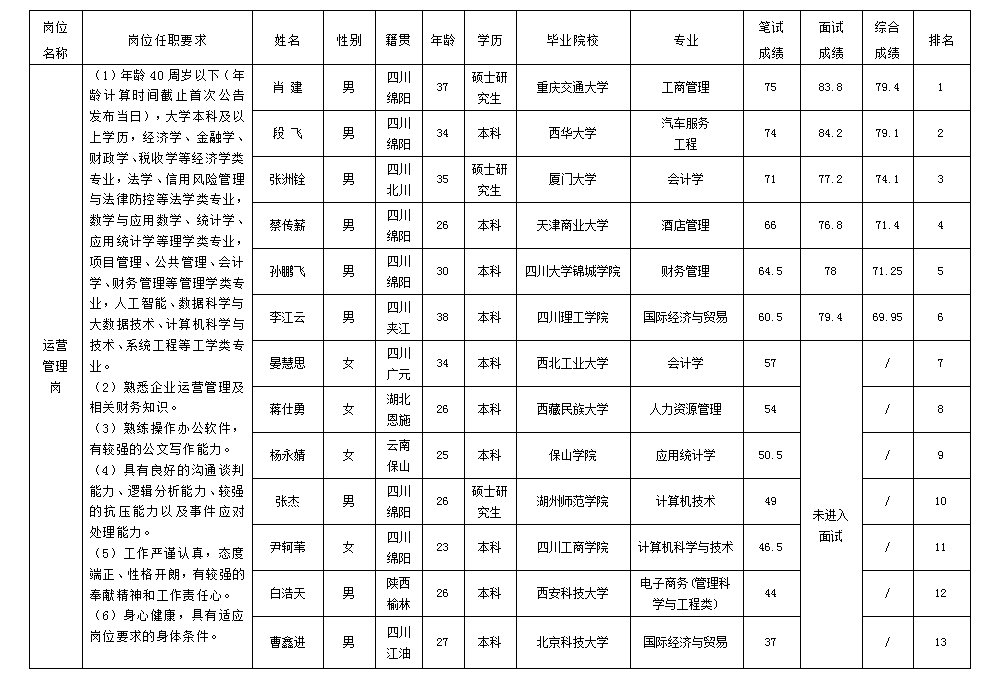 根據(jù)綿陽市投資控股(集團)有限公司發(fā)布的招聘公告及招聘相關(guān)規(guī)定,經(jīng)筆試、面試等程序,現(xiàn)將筆試(面試)成績予以公示。
