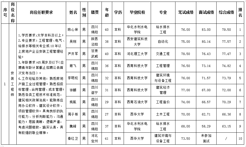 根據(jù)綿陽(yáng)市綿投置地有限公司發(fā)布的招聘公告及招聘相關(guān)規(guī)定,經(jīng)筆試、面試等程序,現(xiàn)將筆試、面試成績(jī)予以公示。