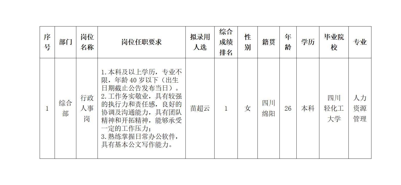 根據(jù)四川綿江能源有限公司發(fā)布的招聘公告及招聘相關(guān)規(guī)定,經(jīng)筆試、面試、考察、體檢等程序,擬錄用苗超云同志到四川綿江能源有限公司工作,現(xiàn)予以公示,具體情況如下: