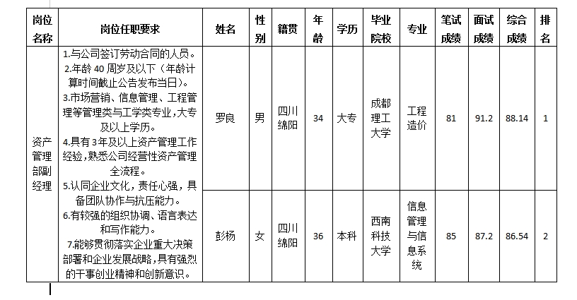 根據(jù)綿陽(yáng)市綿投商業(yè)運(yùn)營(yíng)管理有限責(zé)任公司發(fā)布的競(jìng)聘公告及競(jìng)聘相關(guān)規(guī)定,經(jīng)筆試、面試等程序,現(xiàn)將筆試(面試)成績(jī)予以公示。
