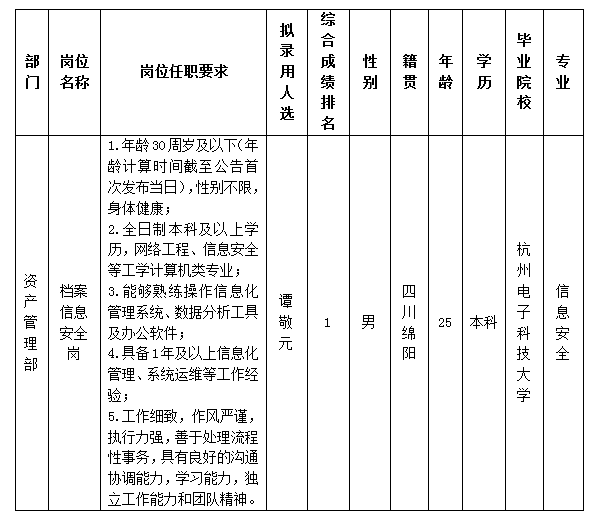 根據(jù)綿陽市綿投商業(yè)運營管理有限責任公司發(fā)布的招聘公告及招聘相關(guān)規(guī)定,經(jīng)筆試、面試、背景調(diào)查、體檢等程序,擬錄用譚敬元同志到綿陽市綿投商業(yè)運營管理有限責任公司工作,現(xiàn)予以公示,具體情況如下: