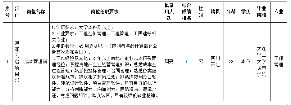 【公開招聘】綿陽市綿投置地有限公司關(guān)于招聘成本管理崗位擬錄用人員的公示