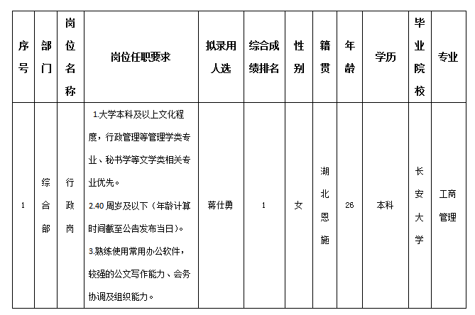 根據(jù)四川越王樓文化傳播有限公司發(fā)布的招聘公告及招聘相關(guān)規(guī)定,經(jīng)筆試、面試、考察、體檢等程序,擬錄用蔣仕勇同志到越王樓公司工作,現(xiàn)予以公示,具體情況如下: