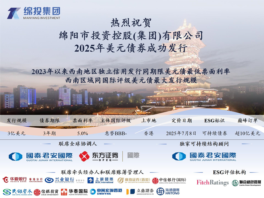 7月8日,綿投集團(tuán)成功定價(jià)發(fā)行3億美元、3年期可持續(xù)美元債券,認(rèn)購(gòu)倍數(shù)3.43倍(峰值訂單超10億美元),最終票面利率強(qiáng)勢(shì)鎖定5.00%,較初始價(jià)格指引大幅收窄70個(gè)基點(diǎn),創(chuàng)2023年以來(lái)西南地區(qū)獨(dú)立信用發(fā)行同期限境外美元債最低票面利率、西南區(qū)域同國(guó)際評(píng)級(jí)美元債最大發(fā)行規(guī)模,以及創(chuàng)2025年以來(lái)中資投資級(jí)地方國(guó)企美元債最大收窄幅度。