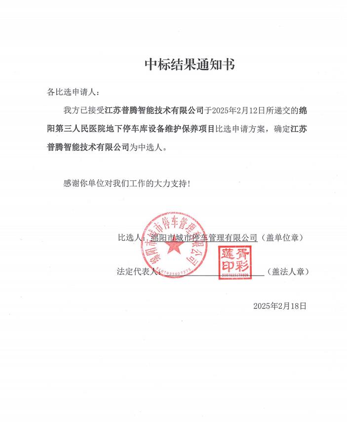 綿陽第三人民醫(yī)院地下停車庫設(shè)備維護(hù)保養(yǎng)項(xiàng)目中標(biāo)結(jié)果通知書