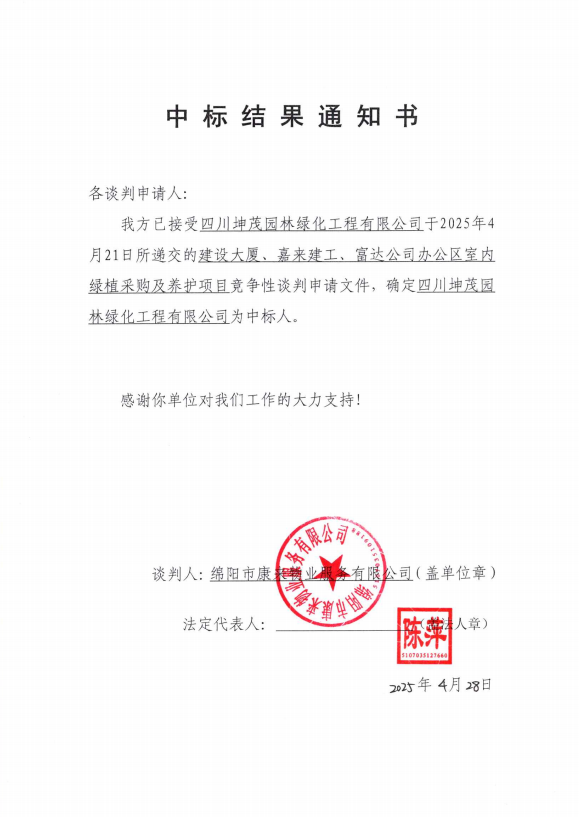 建設(shè)大廈、嘉來建工、富達公司辦公區(qū)室內(nèi)綠植采購及養(yǎng)護項目中標結(jié)果通知
