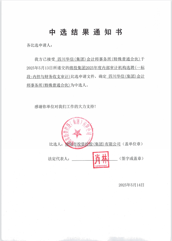 綿投集團(tuán)2025年度內(nèi)部審計(jì)機(jī)構(gòu)選聘中選結(jié)果通知書