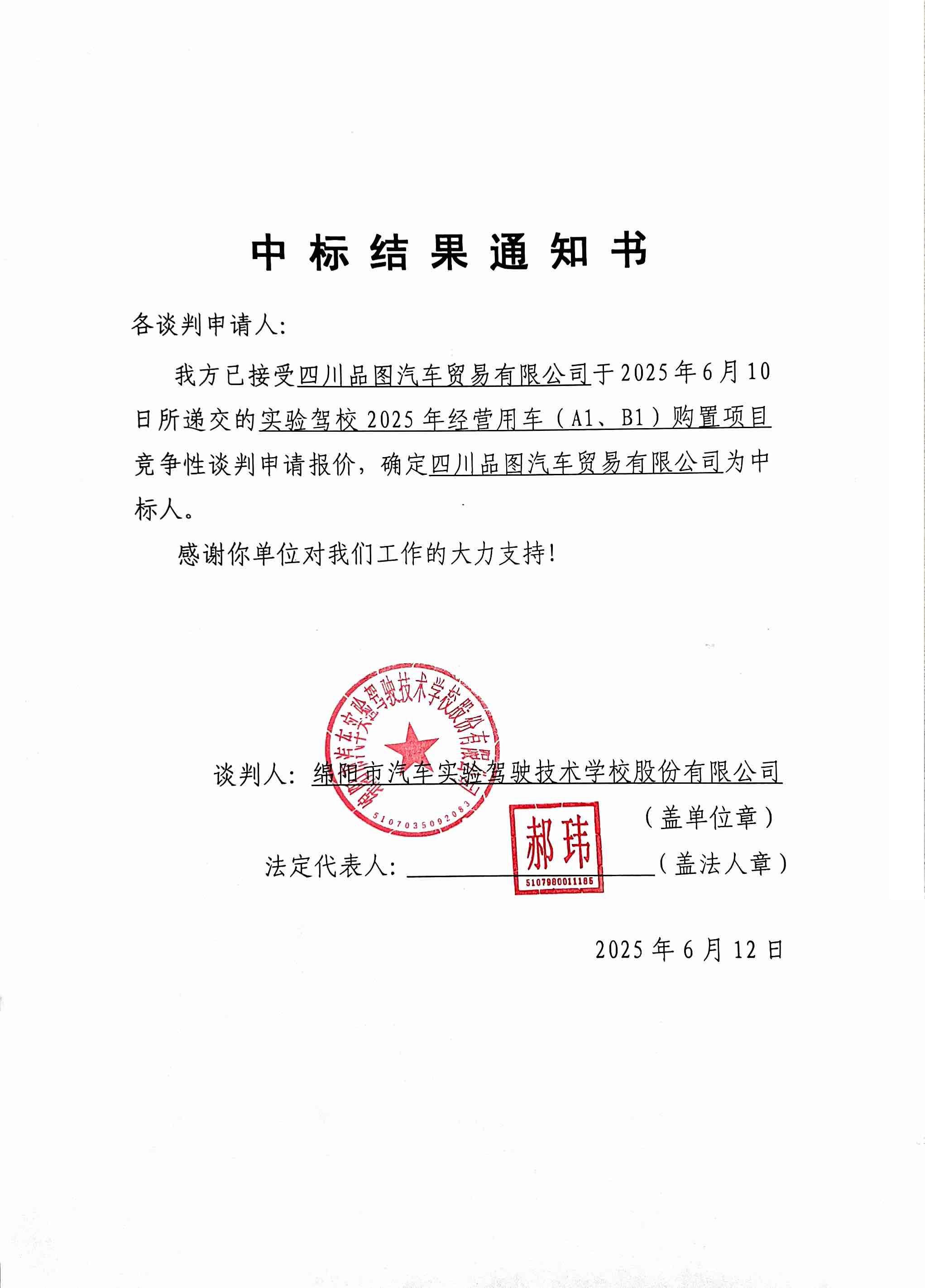 實驗駕校2025年經營用車(A1、B1)購置項目中標結果通知