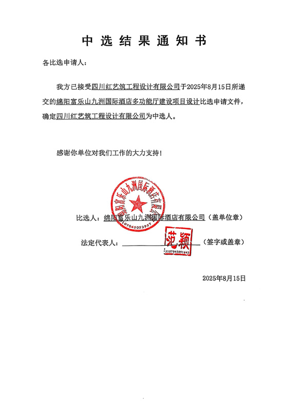 綿陽(yáng)富樂(lè)山九洲國(guó)際酒店多功能廳建設(shè)項(xiàng)目設(shè)計(jì)中選結(jié)果通知