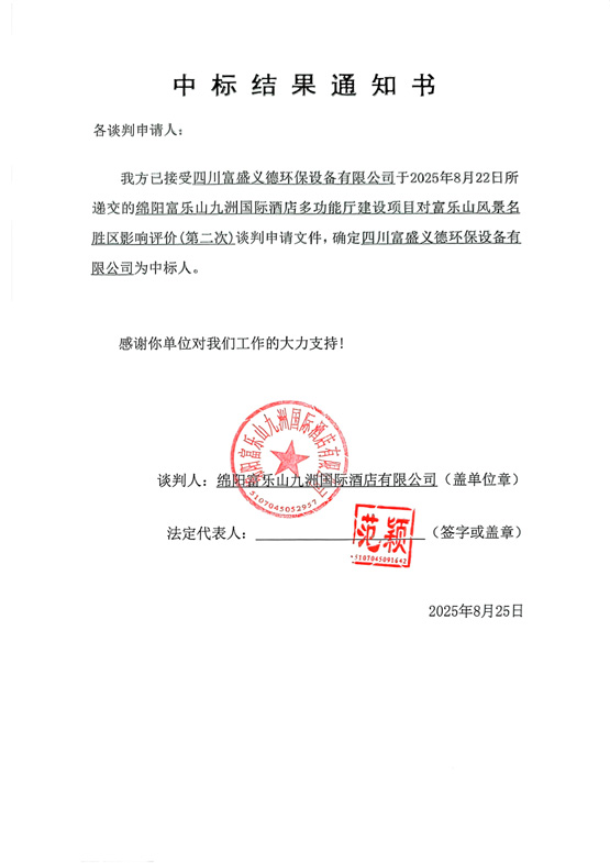 綿陽(yáng)富樂(lè)山九洲國(guó)際酒店多功能廳建設(shè)項(xiàng)目對(duì)富樂(lè)山風(fēng)景名勝區(qū)影響評(píng)價(jià)(第二次)中標(biāo)結(jié)果通知