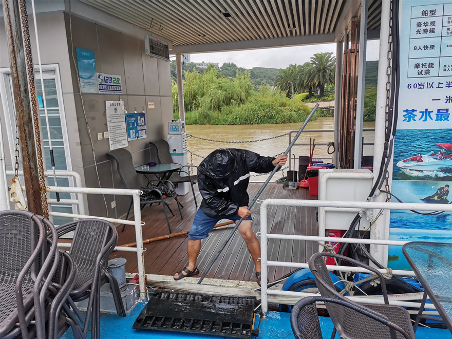 8月17日下午,隨著綿陽市氣象臺(tái)發(fā)布暴雨藍(lán)色預(yù)警,三江碼頭再次遭遇較強(qiáng)降雨考驗(yàn)。越王樓公司根據(jù)實(shí)時(shí)雨情、水情變化,迅速將夜班巡查崗增設(shè)至兩人,加強(qiáng)巡查力度,時(shí)時(shí)掌握碼頭重點(diǎn)部位、關(guān)鍵設(shè)施設(shè)備、商家、各型船只情況,實(shí)時(shí)通報(bào)汛情,做到巡查檢查無盲區(qū),信息交流無障礙。至18日凌晨,涪江瞬時(shí)流量達(dá)到3000m3/秒,越王樓公司立即啟動(dòng)防汛專項(xiàng)應(yīng)急預(yù)案,公司領(lǐng)導(dǎo)第一時(shí)間到達(dá)現(xiàn)場(chǎng),警戒組、搶險(xiǎn)組迅速設(shè)置禁行標(biāo)識(shí),布設(shè)隔離帶,封閉廊橋,放倒廊橋欄桿。同時(shí)通知商家做好應(yīng)汛準(zhǔn)備,安排專人登上游船、餐飲躉船,檢查纜繩系固及動(dòng)桿情況,并沿途查看各關(guān)鍵節(jié)點(diǎn)位防汛工作落實(shí)情況。
